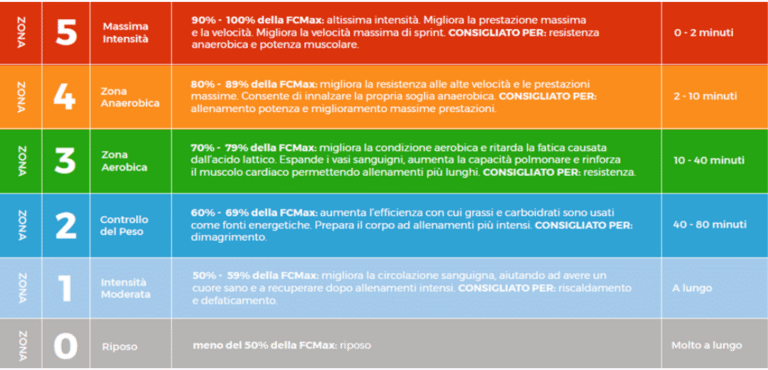 Per farla semplice le zone cardiache sono fasce di intensità basate sulla percentuale della propria frequenza cardiaca massima. Z1 è la zona del recupero attivo: ritmo molto leggero e respirazione facile. Z2 è l’endurance, ideale per migliorare resistenza e metabolizzare i grassi. Z3 è il ritmo medio, impegnativo ma sostenibile. Z4 corrisponde alla soglia anaerobica, dove le gambe iniziano a bruciare. Z5 è lo sforzo massimo, usato solo per lavori brevi e intensi.