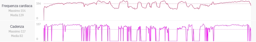 Quando arriva la salita, nonostante i rapporti agili (34/25 o 34/28) la cadenza scende un po’ al contrario della frequenza cardiaca che sale stabilmente in Z3, con qualche inevitabile picco in Z4.
