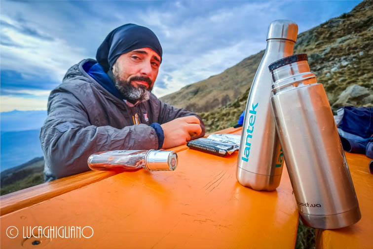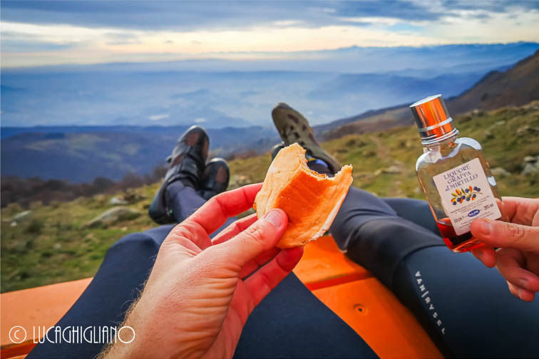 Come sempre ci siamo divisi i compiti: Sandrino ha preparato i panini e portato un quadrato di fondente con nocciole, mentre io ho pensato al caldo con un thermos di tè, uno di caffè d’orzo e mezza fiaschetta di grappa ai mirtilli.